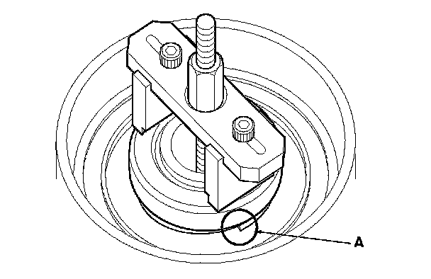 16. Check the placement of the clutch spring compressor attachment. If either end of the clutch spring compressor attachment is not set over the clutch return spring end (A), reset the clutch spring compressor attachment over the return spring end.