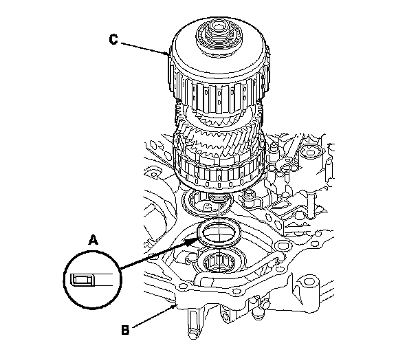 1. Install the thrust needle bearing (A) in the torque converter housing (B) in the direction shown, and install the secondary shaft assembly (C).