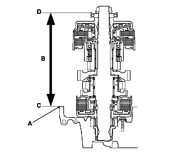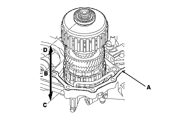 3. Measure the height (B) of the secondary shaft installation between the surface (C) of the gasket and the top of the ball bearing outer race (D), then note the measurement.