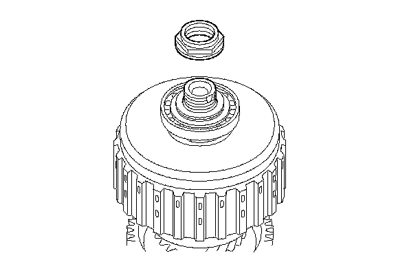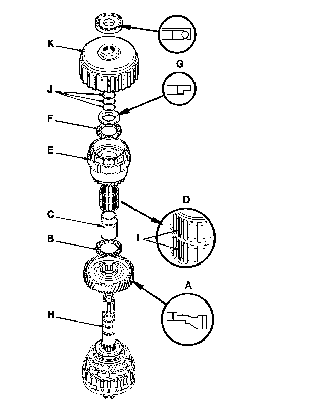 1. Install the thrust needle bearing (A), needle bearings (B), 2nd gear/park gear (C), thrust needle bearing (D), and splined washer (E) in the direction shown on the secondary shaft (F).