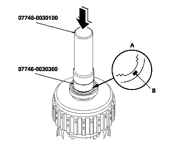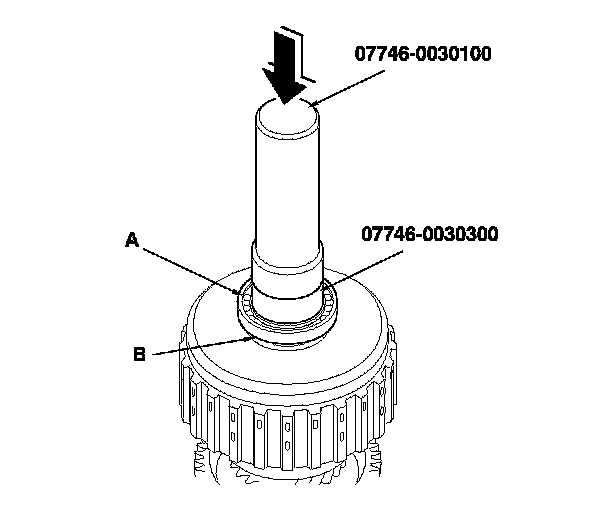 7. Install the ball bearing (A) over the 1st/1st-hold clutch guide (B) using the driver (40 mm I.D.), the attachment (30 mm I.D.), and the press.