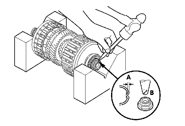 12. Stake the locknut to a depth (A) of 0.7-1.3 mm (0.03-0.05 in.) using a 3.5 mm punch (B).