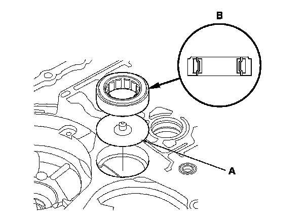 2. Install the ATF guide plate (A) into the housing, then install the new bearing (B) in the direction shown.