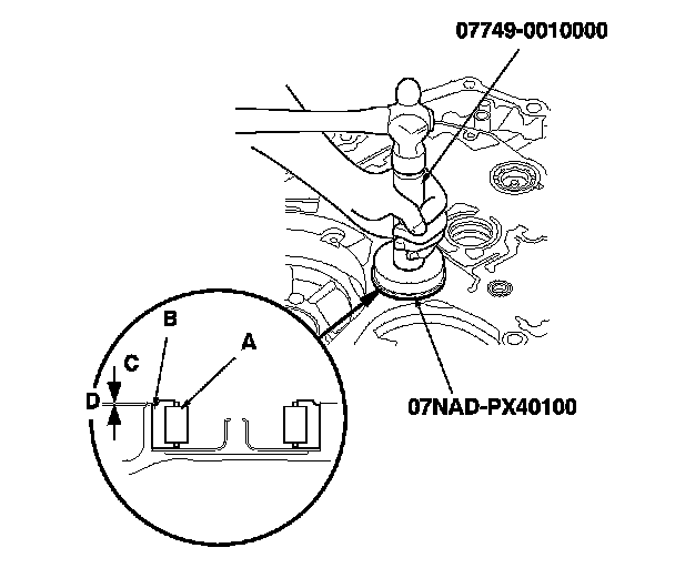 3. Install the bearing (A) in the housing using the driver and the attachment (78 x 80 mm); install the bearing outer notch-cut (B) in depth (C) of 0-0.03 mm (0-0.001 in.) below the housing surface (D).