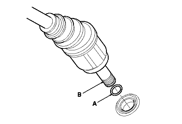 16. Install the new set ring (A) on the left driveshaft (B).