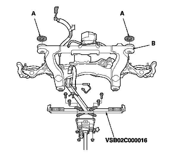 20. Install the front subframe stop rubbers (A) on the front of the subframe (B), and support the front subframe with the front subframe adapter (VSB02C000016) and a jack, and lift it up to body.