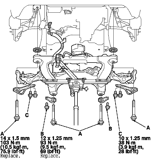 21. Loosely install the new subframe mounting bolts (A), rear stiffener mounting bolts (B), front stiffener mounting bolts (C), and front and rear stiffeners.