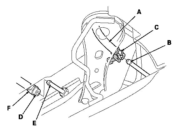 43. Install the stabilizer links (C) to the lower arms, and install the nuts (D). Insert a 6 mm Allen wrench (E) in the ball joint pin (F), and tighten the nuts.