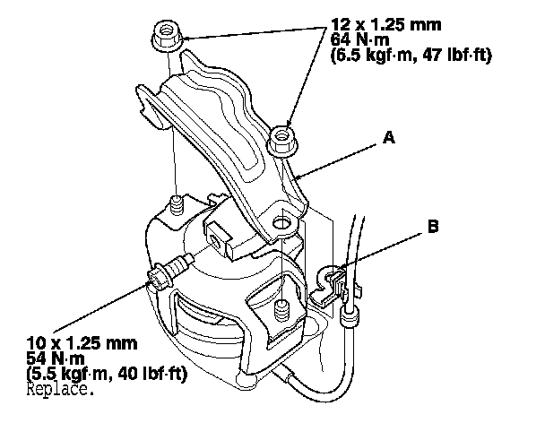 12. Install the front mount bracket (B) with the new mounting bolts.