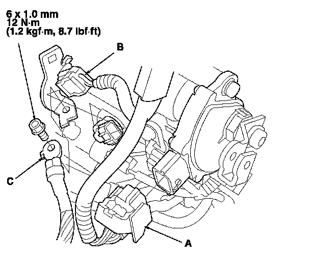 56. Install the transmission ground cable (C).