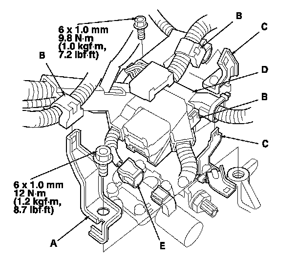 54. Connect the 3rd clutch transmission fluid pressure switch connector (A), output shaft (countershaft) speed sensor connector (B), and ATF temperature sensor connector (C), and install the harness clamp (D) on its bracket (E).