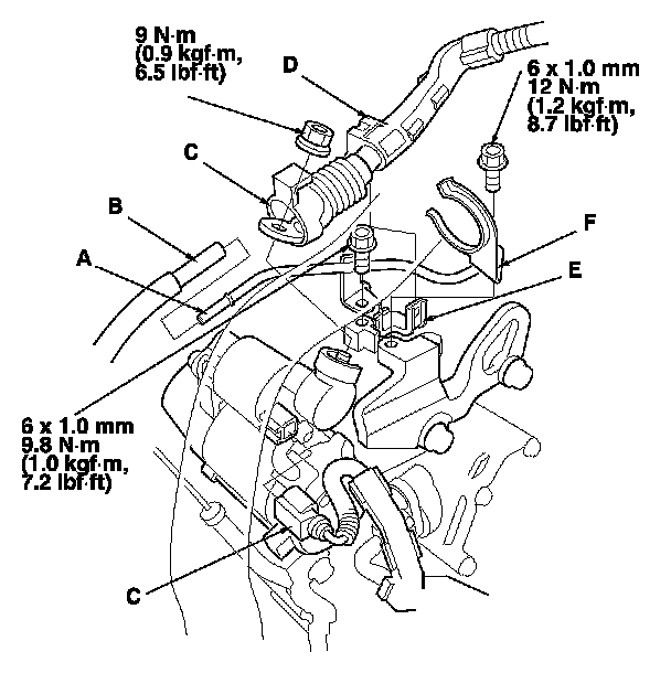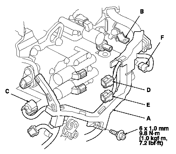 60. Connect the shift solenoid harness connector (C), A/T clutch pressure control solenoid valve A connector (D), A/T clutch pressure control solenoid valve B connector (E), and 4th clutch transmission fluid pressure switch connector (F).