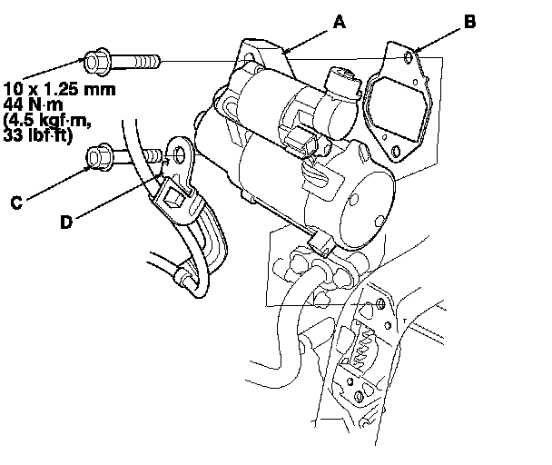64. Install the starter (A) and the new gasket (B); install the lower bolt (C) through the sensor harness clamp bracket (D).
