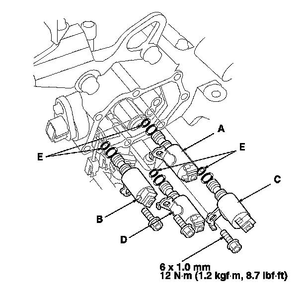 13. Replace the gasket and O-rings (E) with new ones when installing the A/T clutch pressure control solenoid valves A and B.