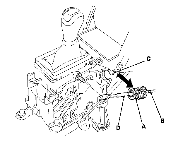 6. Push the socket holder retainer (A) forward, then slide it to remove the shift cable (B) from the shift lever bracket (C). Do not remove the shift cable by pulling the shift cable guide (D).