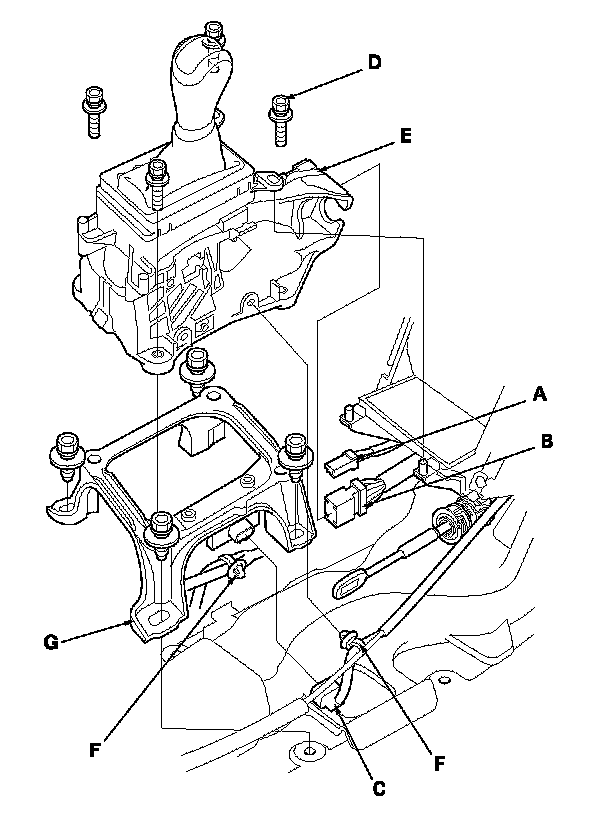 8. Remove the four bolts (D) securing the shift lever bracket (E), and remove the harness clamps (F), then remove the shift lever bracket.