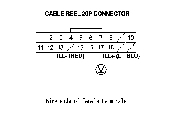 5. Measure the voltage between cable reel 20P connector terminals No. 16 and No. 17.