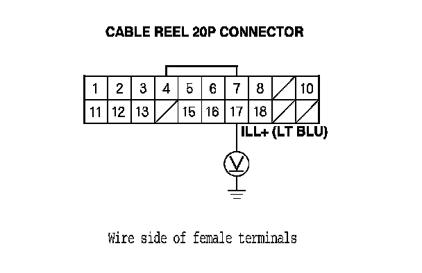 6. Measure the voltage between cable reel 20P connector terminal No. 17 and body ground.