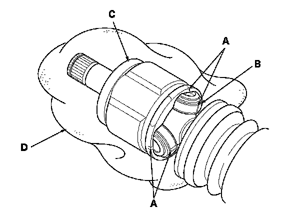 2. Make marks (A) on each roller (B) and the inboard joint (C) to identify the locations of the rollers to the grooves on the inboard joint. Then remove the inboard joint on a clean shop towel (D). Be careful not to drop the rollers when separating them from the inboard joint.