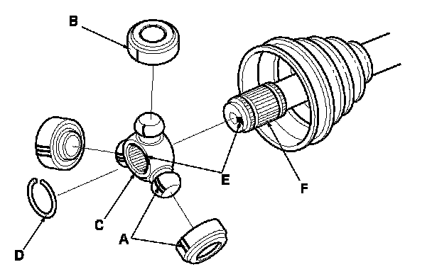 5. Make marks (E) on the spider and driveshaft (F) to identify the position of the spider on the shaft.