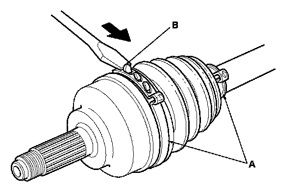 1. Remove the boot bands (A). Lift up the three tabs (B) with a screwdriver. Be careful not to damage the boot.