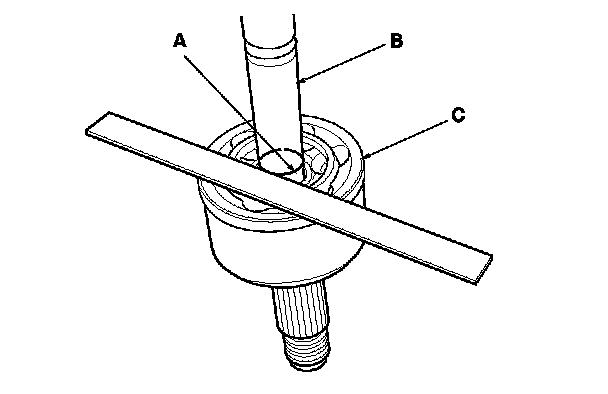 4. Make a mark (A) on the driveshaft (B) at the same level as the outboard joint end (C).