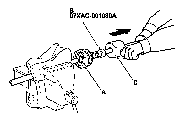 6. Remove the outboard joint (A) using a 26 x 1.5 mm threaded adapter (B) and a commercially available 5/8'' x 18 UNF slide hammer (C).