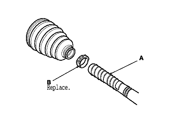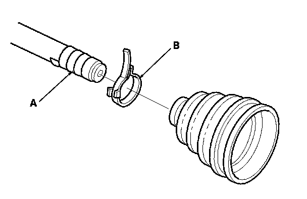12. Fit the boot ends onto the driveshaft and the inboard joint, then install a new double loop band (A) onto the boot (B).