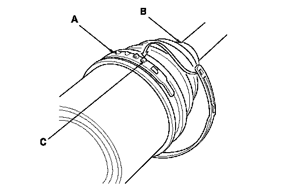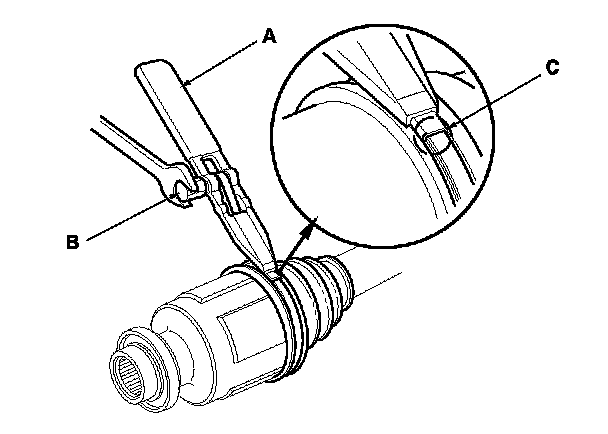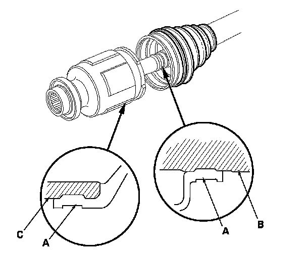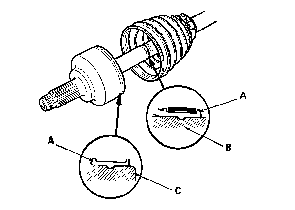 9. Fit the boot ends (A) onto the driveshaft (B) and the outboard joint (C) grooves. Bleed any excess air from the boots by inserting a flat-tipped screwdriver between the boot and the joint.