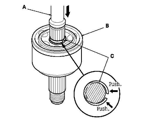5. Insert the driveshaft (A) into the outboard joint (B) until the stop ring (C) is closed to the joint.