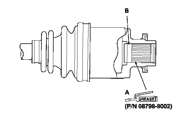 1. Apply 1.5-2.0 g (0.05-0.07 oz) of super high tempurea grease (P/N 08798-9002) to the whole splined surface (A). After applying grease, remove the grease from the splined grooves at intervals of 2-3 splines and from the set ring groove (B) so that air can bleed from the differential.