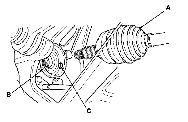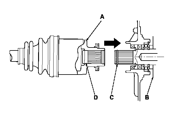 5. Insert the inboard end (A) of the driveshaft into the differential (B) until the set ring (C) locks in the groove (D).