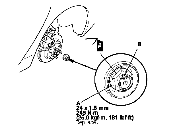 8. Install the spindle nut, then torque the nut. After tightening, use a drift to stake the spindle nut shoulder (B) against the driveshaft.