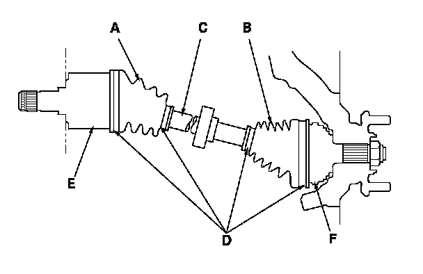 3. Check the inboard joint (E) and the outboard joint (F) for cracks and damage. If any damage is found, replace the inboard joint or the outboard joint as an assembly.