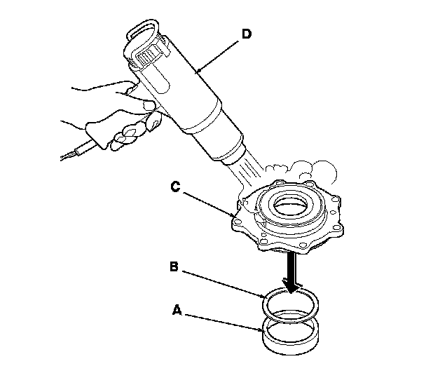 1. Remove the bearing outer race (A) and 80 mm thrust shim (B) from the transfer cover (C). If the bearing outer race is press-fitted, remove the outer race by heating the cover to about 212 °F (100 °C) with a heat gun (D). Do not heat the cover more than 212 °F (100 °C).