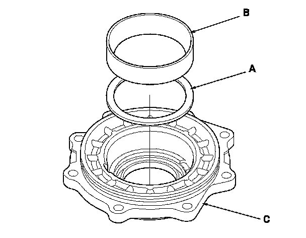 2. Install the 80 mm thrust shim (A) and bearing outer race (B) in the transfer cover (C).