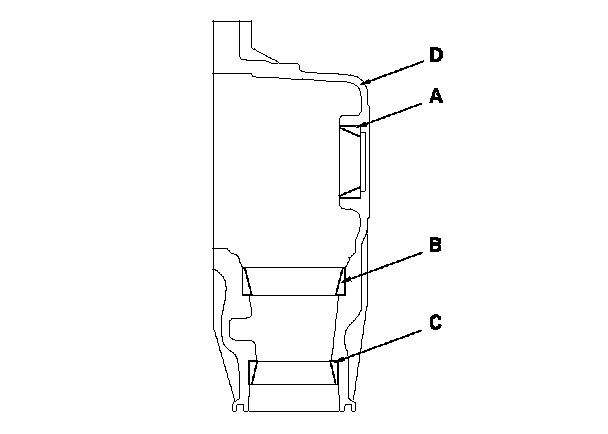 1. Remove the 52 mm bearing outer race (A), 75 mm outer race (B), and 65 mm outer race (C) from the transfer housing (D).