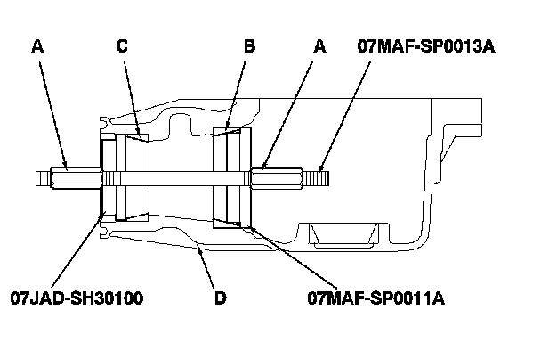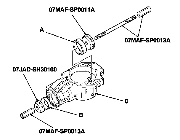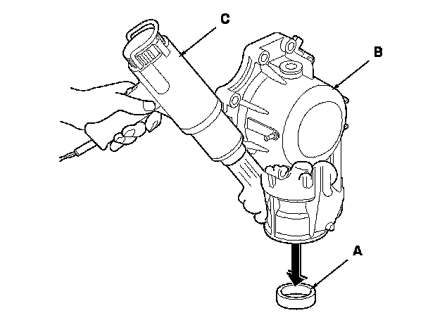 4. Install the 75 mm bearing outer race (A) and 65 mm bearing outer race (B) in the transfer housing (C), set the attachment (65 mm) and the tapered bearing race installer A over the races, and install the installer shaft through the attachment and installer.