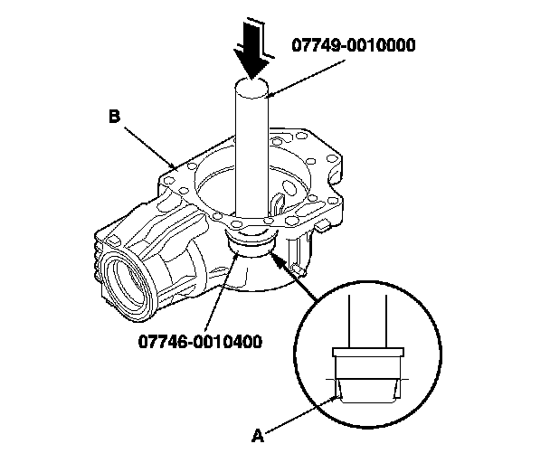 3. Install the 52 mm bearing outer race (A) until it bottoms in the transfer housing (B) using the driver and the attachment (52 x 55 mm).