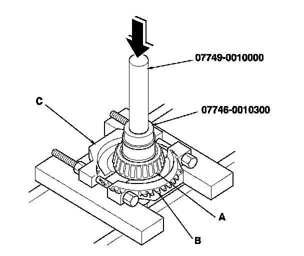 1. Remove the tapered roller bearing (A) from the transfer hypoid drive gear (B) using the driver, the attachment (42 x 47 mm), bearing separator (C) and a press.