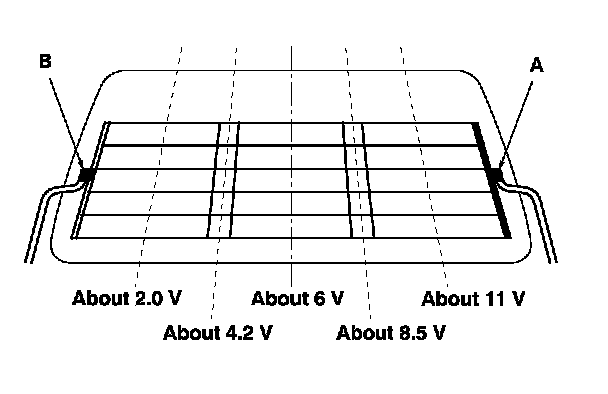 1. Measure the voltage between the positive terminal (A) and body ground with the ignition switch and defogger switch ON.