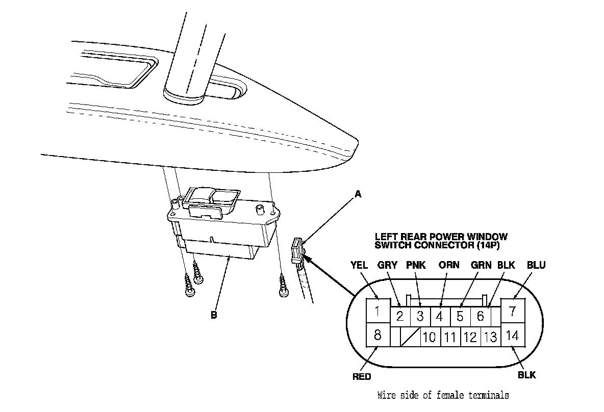 3. Disconnect the 14P connector (A) from the left rear power window switch (B).