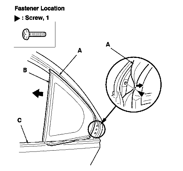 6. Pull the door weatherstrip (A), and remove the screw, then remove the quarter glass (B). Take care not to damage the outer weatherstrip (C).