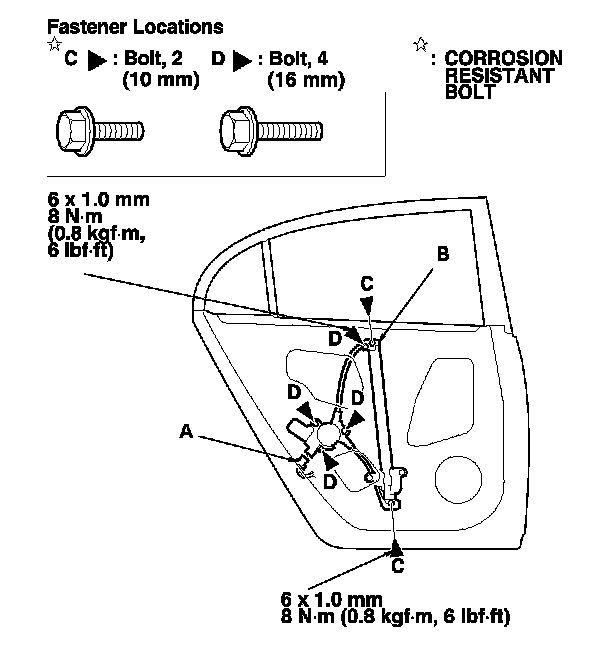 9. Remove the bolts (C), and loosen the bolts (D), then remove the regulator through the hole in the door.