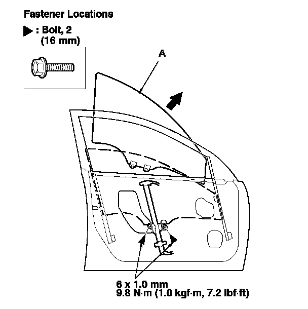 2. Carefully raise the glass (A) until you can see the bolts through the oval holes in the door, then remove them. Carefully pull the glass out through the window slot. Take care not to drop the glass inside the door.