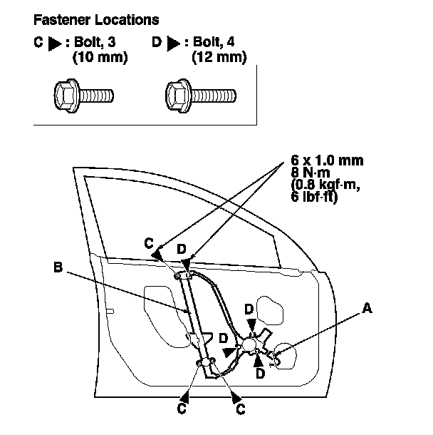 4. Remove the bolts (C), and loosen the bolts (D), then remove the regulator through the hole in the door.