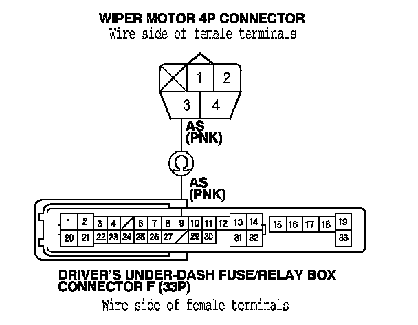 9. Check for continuity between wiper motor 4P connector terminal No. 3 and driver's under-dash fuse/relay box connector F (33P) terminal No. 9.