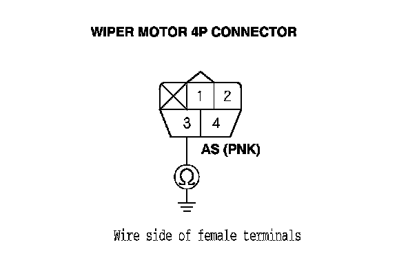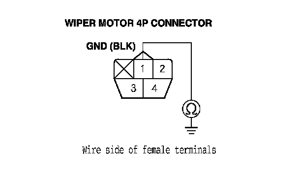 18. Measure the voltage between body ground and wiper motor 4P connector terminal No. 2 with the wiper switch ON (Low), and measure the voltage between body ground and wiper motor 4P connector terminal No. 4 with the wiper switch ON (High) respectively.