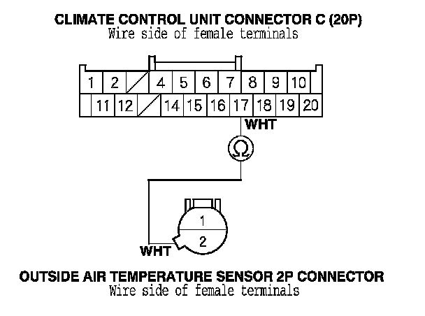 8. Check for continuity between climate control unit connector C (20P) terminal No. 17 and outside air temperature sensor 2P connector terminal No. 2.