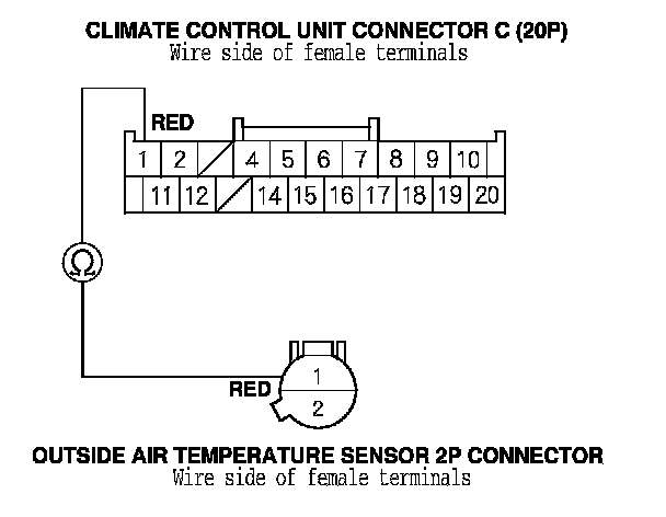 9. Check for continuity between climate control unit connector C (20P) terminal No. 1 and outside air temperature sensor 2P connector terminal No. 1.